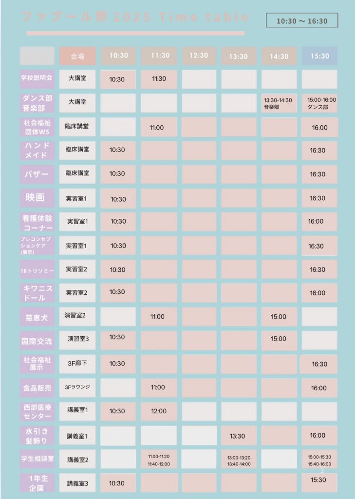 看護学科の学生が企画運営する文化祭が「ファブール祭」です。今年度も、飲食の模擬店を実施致します。様々な企画により、歴代の先輩方の伝統を継承したファブール祭を今年度も盛り上げていきたいと思います。