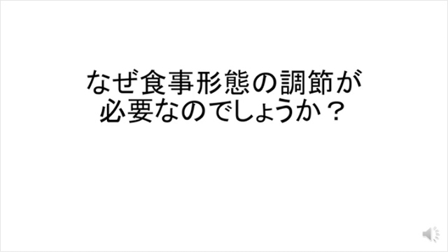 嚥下調整食の作り方をアップロードしましたのでご参照ください。なお、まず「【はじめに】なぜ、食事形態の調整が必要か」をご覧いただいた後、①から⑦までございます動画を順番にご覧ください。