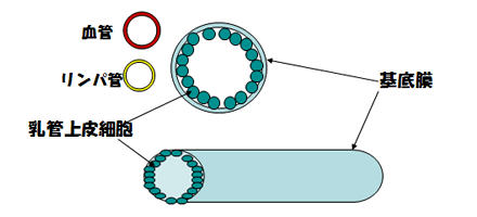 乳腺原発の悪性腫瘍は悪性葉状腫瘍、悪性リンパ腫、肉腫など種々存在しますが、99%は癌腫(乳がん)です。たとえば胃がんが胃壁を構成する腺上皮から発生するように、乳がんは基底膜という構造で覆われた乳管という細い管を構成する乳管上皮から発生します。