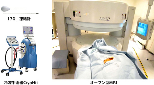 現在われわれが用いるのは、 わが国で唯一薬事承認が得られている、Galil Medical社製の冷凍手術器(CryoHit)で、これは常温の高圧気体をジュールトムソン効果で低温にする方法です。この際には17G(径1.47mm)の凍結針を用います。超音波ガイド下に穿刺を行い、凍結中はMRIで凍結範囲のモニターを行います。