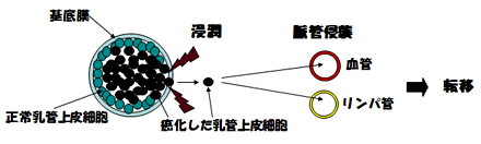 乳がんは、乳管の壁を構成する乳管上皮細胞の一つがなんらかのきっかけで、がん化することから始まります。がん細胞は細胞分裂を繰り返し、その数をとめどなく増やしていくことで成長していきます。そしてある時期を過ぎると(基底膜を破って外に出る)、がんのがんたる所以である、他臓器への転移を惹起する能力を獲得します。これ以後を浸潤がん、それ以前を非浸潤がんと呼んでいます。時々、浸潤がんは全て転移を起こし死に至るものと誤解している人がありますが、乳がんの70%は治癒が期待できるのです。