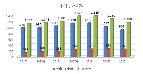 慈恵医大柏病院外科の年間手術数の推移を下記に示します。2020年の手術合計は1,158例、全身麻酔手術は909例、腰椎・局所麻酔手術は249例でした。