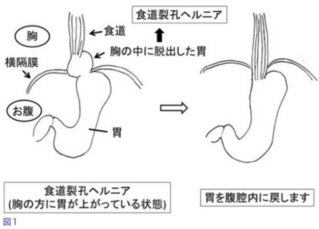 - 胸にある食道と,腹部にある胃の境界が食道裂孔と呼ばれ,横隔膜の孔の部分になります.ここを食物が通過していくわけですが,この部分の筋肉が緩むと裂孔が大きくなり,胃が裂孔を通して胸の方へ持ち上がってしまいます.この状態を食道裂孔ヘルニアといいます(図1)