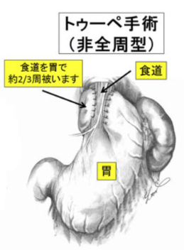 まず胸の中に入り込んでいる胃を腹部に戻し、次に緩んで広がった裂孔を縫い縮めます。そして胃を食道に巻きつけて、逆流防止弁が作成されます。食道の後ろを中心に約2/3周巻き付ける方法をToupet手術(トゥーペ法)といい、当施設では、これまでの検討からToupet法が最適な術式と考え、大半の患者さんにToupet法を行っています。
