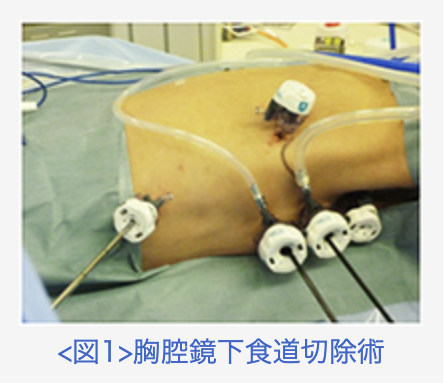 - 鏡視下手術を導入しており、食道表在がんには胸腔鏡(図1)と腹腔鏡による手術、早期胃がんに対しては腹腔視下手術を行っています。