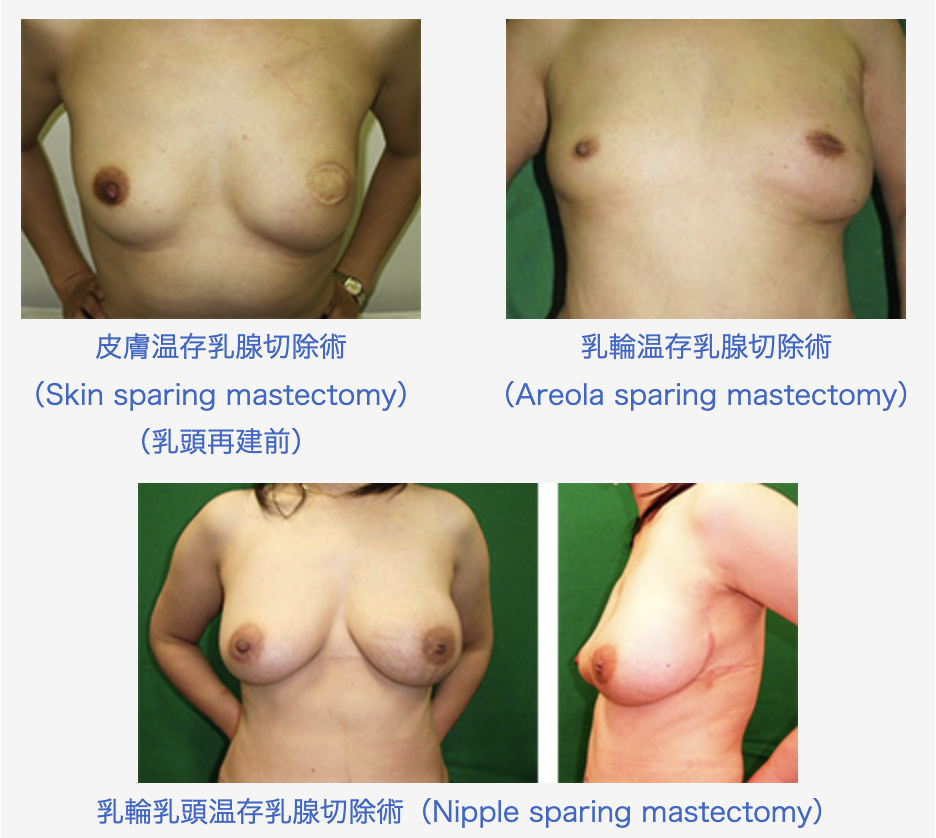 日本における乳がんの手術法は、昭和の末を機に大きく変わりました。およそ30年前は、全乳房と大小胸筋、腋窩を含む広汎なリンパ節郭清を主とする、19世紀末に始まった“定型的(胸筋合併)乳房切除術”が過半数を占めておりました。その後手術の縮小化が進み、胸筋を温存する“非定型的(胸筋温存)乳房切除術”をへて、乳房温存術が主流を占めるようになり、さらに20世紀末のセンチネルリンパ節生検の登場により現在に至っています。したがって近年では、手術療法の主体は局所制御であり、がんの根治性と機能温存・審美性をできる限り満足させうる術式のオプションを個々の状況に応じて提供しています。当科では手術の約半数が温存術であり、センチネルリンパ節生検の併用により腋窩郭清を省略する機会も多くなっています。また、温存術が適さない場合にも、希望があれば、形成外科との協力下に一期的乳房再建術を積極的に取り入れています。その際には、自己の乳房皮膚をほぼすべて残すskin sparing mastectomy、乳輪まで温存するareola sparing mastectomy、乳輪乳頭まで温存するnipple sparing mastectomy(図)を行っており、術後の美容上の整容性だけでなく、がんの根治性においても良好な成績を収めています。また、2013年夏にシリコンインプラントによる乳房再検が保険収載されたことにより、再建方法のオプションがさらに広がりました。