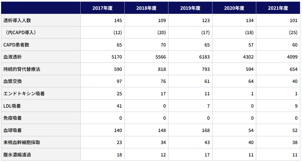 当院が中心になり全国に先駆けて行った治療で、現在では、多くの施設で行われるようになりました。CAPD患者さんは、年数が経過すると透析不足になりやすいため、週5回のCAPDと週1回の血液透析を併用して、患者さんのQOLを保ちながら、適正な透析を行っていく治療法です。