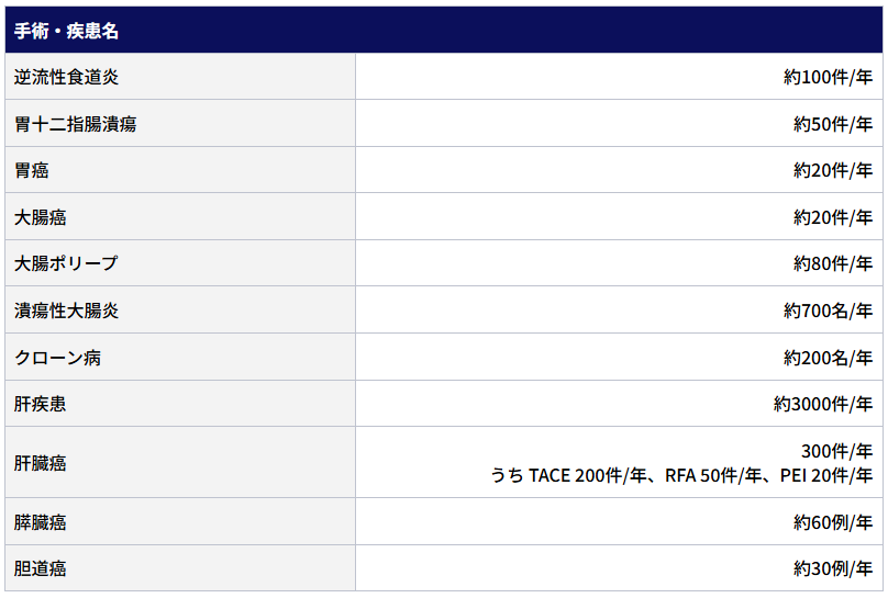 - 炎症性腸疾患(潰瘍性大腸炎、クローン病)、消化性潰瘍、逆流性食道炎、食道・胃静脈瘤などの消化管疾患、および、千葉県肝炎対策指定医療機関として、慢性ウイルス性肝炎(C型、B型肝炎)をはじめとする肝臓疾患の診療や胆道膵臓腫瘍を主に行っています。