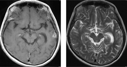 肺癌による左側頭葉転移性脳腫瘍に対してEGFR変異陽性の結果を踏まえて イレッサ(ゲファチニブ)の単独投与のみで治療したところ、腫瘍が著明に縮小しました。その後再発なく経過しています。