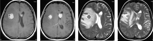 腎臓癌による左前頭葉深部白質の転移性小脳腫瘍に対して開頭腫瘍摘出術を施行し全摘しました。脳浮腫の懸念がなくなったため術後ガンマナイフを併用しました。5年以上再発なく経過しています。
