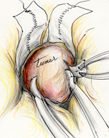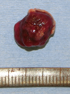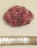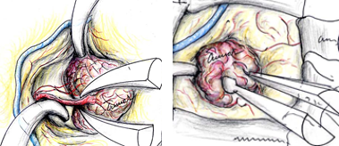 腎臓癌の脳転移巣は腫瘍サイズが小さい割に脳浮腫が強い場合が多いです。写真で呈示した如く転移性脳腫瘍の肉眼所見は、血管奇形や血管腫と似ており正常脳との境界がわかりやすいため比較的摘出は容易です。また広範囲な脳浮腫も腫瘍を全摘すると消失します。