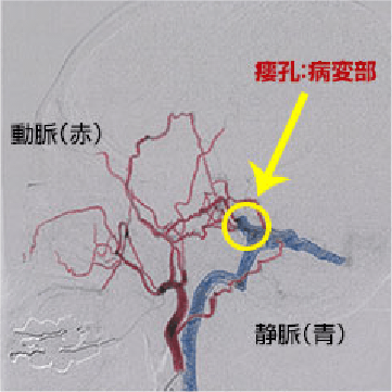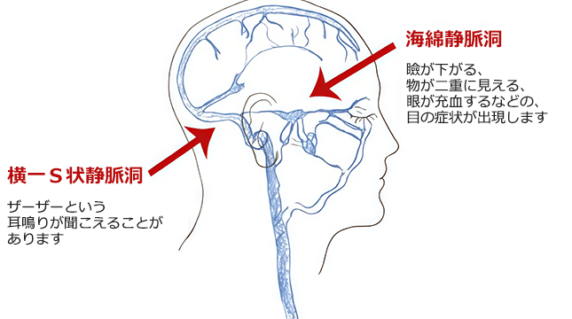 頭の中にある、非常に太い静脈である「静脈洞」と、「動脈」とが、様々な原因で直接交通してしまう病気です。これにより、圧の高い動脈の血液が、本来は圧が低い静脈に流れ込むことになり、静脈洞の中の圧が上がってしまい、脳のうっ血をきたしてしまいます。 このうっ血が原因となって、脳出血や痙攣などの症状が出現する場合があります。