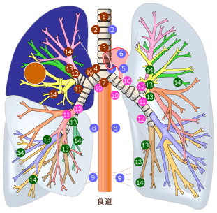 肺がんの標準的手術では、右肺上葉に肺がんがあると、青色の右肺上葉と茶色の番号のリンパ節を切除します。