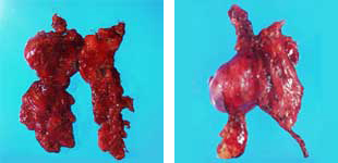 左写真は重症筋無力症に対して拡大胸腺全摘術により切除した胸腺です。向かって左上に1.5cmの胸腺腫を合併していました。