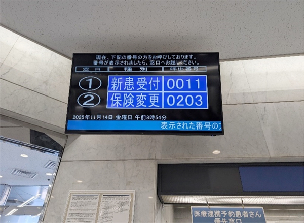 • 院内でのお薬引換券をお持ちの方は、薬剤部窓口横モニター画面にお薬引換券の番号が表示されます。ご自分の番号が表示されましたら、窓口でお薬をお受け取りください。