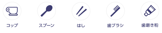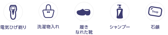 洗⾯⽤具(ボディソープ、シャンプー、⻭ブラシ、ティッシュペーパー、ひげ剃り、くしなど)