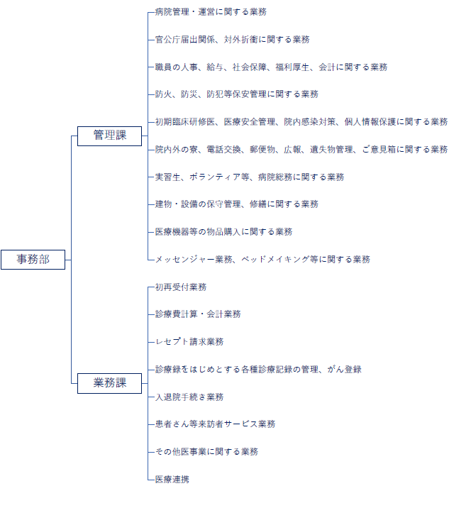 私たち事務部は、医師・看護師並びに各部署と連携・協働し、チーム医療の一員として常に患者さんの立場で考え、医療・患者サービスに関わっています。各部門が有機的に機能できるようその役割を十分認識し、地域の皆様に信頼される病院をめざします。