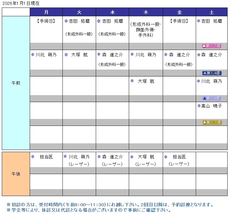 形成外科 外来担当医スケジュール