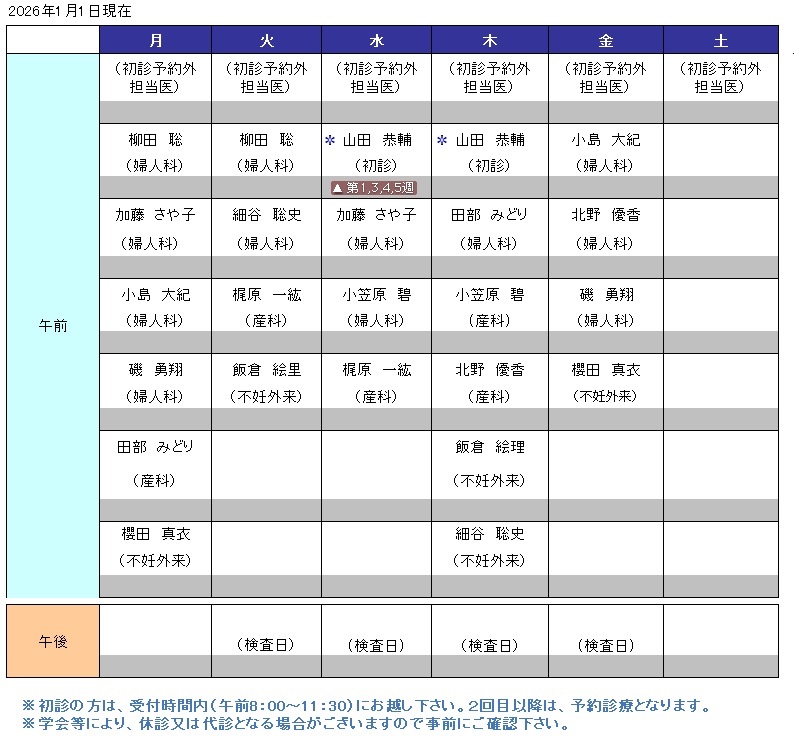 産婦人科 外来担当医スケジュール