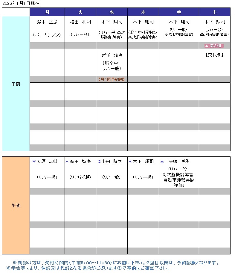 リハビリテーション科 外来担当医スケジュール