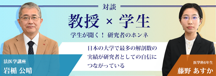 対談 教授 x 学生 学生が聞く!研究者のホンネ ホーム東京慈恵会医科大学TOP医学部医学科医学部医学科 学生生活対談 教授 x 学生 学生が聞く!研究者のホンネ [氏名肩書はインタビュー当時] 第22回 法医学講座 岩楯 公晴 [2025年 12月 2日] 第21回 小児科学講座 大石 公彦 [2025年 8月 20日] 第20回 心臓外科学講座 國原 孝 [2025年 6月 27日] 第19回 薬理学講座 青木友浩 [2024年 12月 6日] 第18回 救急災害医学講座 武田 聡 [2024年 11月 20日] 第17回 内視鏡医学講座 炭山 和毅 [2024年 6月 27日] 第16回 細胞生理学講座 南沢 享 [2023年 12月 4日] 第15回 内科学講座 循環器内科 吉村 道博 [2023年 11月 13日] 第14回 内科学講座 脳神経内科 井口 保之 [2023年 6月 23日] 第13回 内科学講座 呼吸器内科 桑野 和善 [2022年 12月 13日] 第12回 外科学講座 血管外科 大木 隆生 [2022年 7月 12日] 第11回 環境保健医学講座 須賀 万智 [2022年 4月 11日] 第10回 細菌学講座 金城 雄樹 [2021年 11月 5日] 第9回 脳神経外科学講座 村山 雄一 [2021年 6月 30日] 第8回 整形外科学講座 斎藤 充 [2021年 2月 5日] 第7回 解剖学講座 岡部 正隆 [2021年 1月 18日] 第6回 内科学講座 腎臓・高血圧内科 横尾 隆 [2020年 11月 18日] 第5回 精神医学講座 繁田 雅弘 [2020年 7月 4日] 第4回 熱帯医学講座 嘉糠 洋陸 [2020年 2月 25日] 第3回 リハビリテーション医学講座 安保 雅博 [2019年 12月 18日] 第2回 臨床検査医学講座 松浦 知和 [2019年 7月 29日] 第1回 ウイルス学講座 近藤 一博 [2019年 2月 8日]